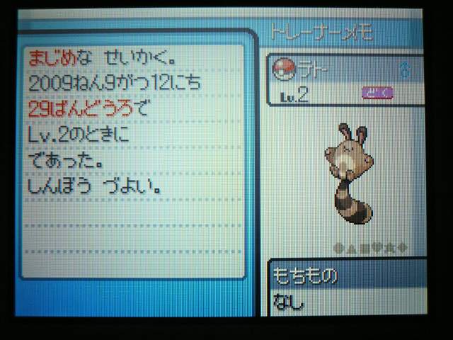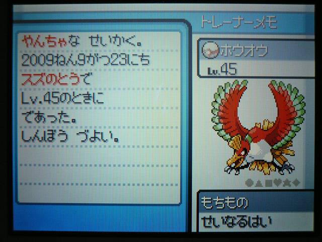 タテにすんの忘れてた。 そろそろ残り容量がヤバイので、1TBのハードディスクを買ってきました。 古い壊れたハードディスクのケースを使おうと思ったのですが、 どこに片付けたのか わからず、 しかもSATAケーブルもなかったため、今は接続できず・・・ まぁ 急ぎでもないし、また今度 ケーブル買ってこようっと。 パーツ屋にも寄ったので、Wiiのセンサーバーの自作に挑戦してみました。 ちと雑だけど、シロウトにしては 上出来か? 純正センサーバーのLEDは片方5個だけど、 ちょっと欲張って 6個にしてみました。これで感度アップ? 光りました! でも ちょっと弱いです。 使ってみました。 反応は するものの、やはり光が弱いのか 垂直に向けないと感知しないもよう。 さすがに単2電池1個では弱いか。LED12個の消費電力をナメてました。 しかし、遊びでやっただけなので、反応しただけでも満足。 改良すれば 実用化も可能かも。 のんびりプレイしていて ようやくホウオウゲット! やはりプレミアボールで。 この頃にはジョウトのジムバッジも全て集まっていて、 レベル100のポケモンも 言うことを聞くので、 高レベルのパラセクトを呼び寄せて みねうちとキノコのほうしで極限状態に。 ここで捕獲率を調べてみると、その確率は2.1061%! ホウオウに出会うイベントが 儀式になっていて神秘的。 バトル中のBGMも和風な感じになっていて かっこいい。 本当は 強制イベントになってほしくなかったのだが、 逃げたり倒したりしても また出会うことは出来るので まぁいいか。 儀式を行なった人が それを教えてくれる。 強制イベントにすることで ホウオウの存在を強調するものとなっていたので、 これはこれでいいかも。 プレイ開始しました ポケモン ハートゴールド。 GB版でも金をやっていたため、今回もゴールドを選択。 当時は映画の効果もあってか 銀が人気があり、 今でも シルバーのほうが人気があるようですが、それでもゴールドなんです。 ジョウトでも大流行らしいです。 「みんなのポケモン牧場」も ゴールド・シルバー対応になってほしいものです。 GB版の頃は 部屋の もようがえが可能だったけど、今回は ないのかな。 まぁ、自宅に帰ることって 滅多にないからねぇ。 ポケモンの回復や整理もできないし。 ウツギ博士の研究所が2階立てに!? そして 研究所をのぞいている不審者君はなんだ? いいえ、ライバルです。どちらにせよドロボウしますけど・・・ ダイヤモンド・パールでは ポケッチが常時表示されていたけど、 今回ではメニュー画面に。 常時これが表示されていて、タッチで選択可能。 Xボタンを押せば ボタンでも操作可能。 道具のお気に入りも 2つまで登録でき、下画面にも表示されます。 ぶっちゃけポケッチよりも こっちがいいよ。 ボックス操作も下画面で可能に。 ほとんどの操作に タッチスクリーンを活かせるよう、通信交換の画面も上下逆に。 ダイヤモンド・パールの頃は タッチスクリーンで直接移動できればいいのにと思ったのにと、 ずっと疑問に思っていましたが、ようやく実現しましたね。 仲間にオタチを捕まえました。 進化も早く、覚える技も多彩。扱いやすく初心者には うってつけ。 オオタチに進化すれば かなりすばやい。 GB版の頃は 技マシンで3色パンチも覚えさせることも可能でしたね。 3色パンチが「ぶつり」になった今こそ 覚えさせたいぐらいですが・・・ れいとうビーム・10まんボルト・かえんほうしゃ では活かしきれないですからね・・・ いや、できたてのホカホカをくれ。 ・・・冗談だそうです。 今回のランニングシューズは、Bボタンを押しながら走るだけでなく、 タッチスクリーンで ホールド状態にして Bボタンを押さなくても走ることも可能! 片手操作のときに 便利かも。 そういえば ずつきで木を揺らして ポケモンを探すことも可能でしたな。 GB版では 技マシンも普通に売られていて、ひるませる効果もあったりと、 基本技としても 便利な技でした。 しかし今回、92の技マシンの中には「ずつき」はない。 一体どのようにして 覚えられるのだろう・・・ しかし、木を揺らすのに「頭突き」とは・・・ 「しねんのずつき」や「もろはのずつき」では対応してないのかな。 おお! キキョウジムが無意味に高く! からくり屋敷ですかい ここは。 鳥ポケモンの気持ちを知るためらしいです。 もし誤って落下したら 持っている鳥ポケモンに助けてもらうのでしょうか。 最初にチコリータを選んでいると 少々不利なジム。 それでも イシツブテを使えばラクですけどね。 私は今ここ、アルフの遺跡にたたずんでおります。 そういえば アンノーンを全て集めると、 この建物で ポケットプリンタでプリントできる機能なんてのもあったなぁ。 水辺に近づくと 水の音が聞こえます。 リニアのレールが見えます。 これがカントーの ヤマブキシティへと続いているんだよなぁ。 今回の目玉 ポケウォーカーを使ってみました! 画面は けっこう観やすい。 時計