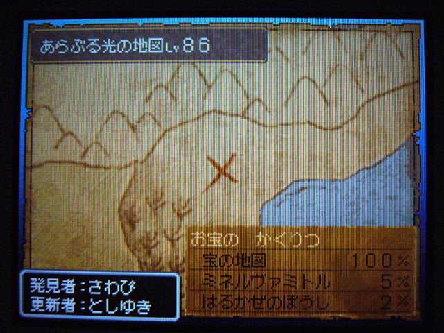 特に大きなものは買わなかったけど、 未だにマジコンが露店で販売されているのを 見かけます。 そのほか 某店で「丁果」という名のゲーム機を目にしました。 調べてみると ちょっとヤバめな部分もあるゲーム機ですが、 こんなのも 売ってるんだなと思いました。 SDカードリーダーが380円と格安だったので 2個買いました。 同じ製品なはずなのに、若干構造が違ってたりしますが・・・ ロットの問題かな? 落とすと簡単にヒビが入りそうな外装ですが、 SDHC32GBまでオケーだったりと、わりと高性能っぽい。 日本橋ではないけど、帰り道のミドリ電化で、 Bluetoothのアダプタが1000円だったので、買いました。 これで Wiiリモコンを接続できるらしいので、いつか やってみたい。 もちろん ドラクエ9のすれちがい通信も やってきました。 例の「まさゆきの地図」が3枚ほど手に入りました。 どうやら けっこう流通しているもよう? しかし、それ以外にもメタルキングハウス付きの地図が出たようで、 「あらぶる運命の地図Lv84」というもの。 こちらは B11に出現、お宝も なかなかのもの。 こっちに乗り換えるかも・・・