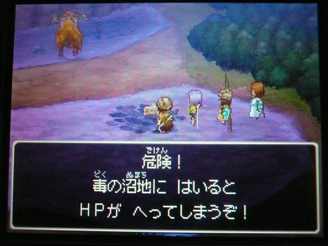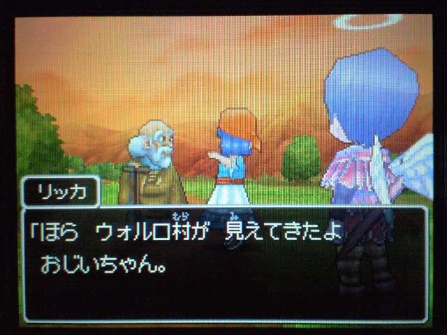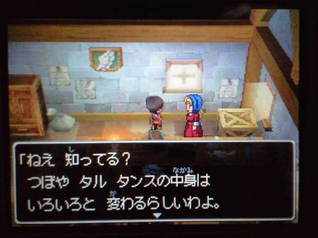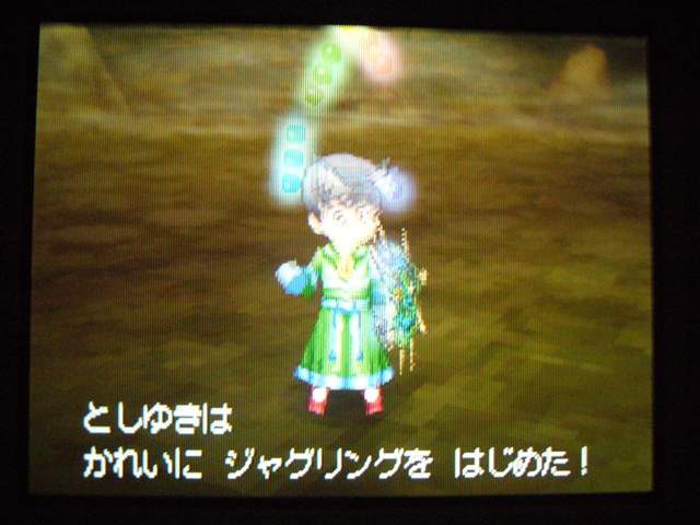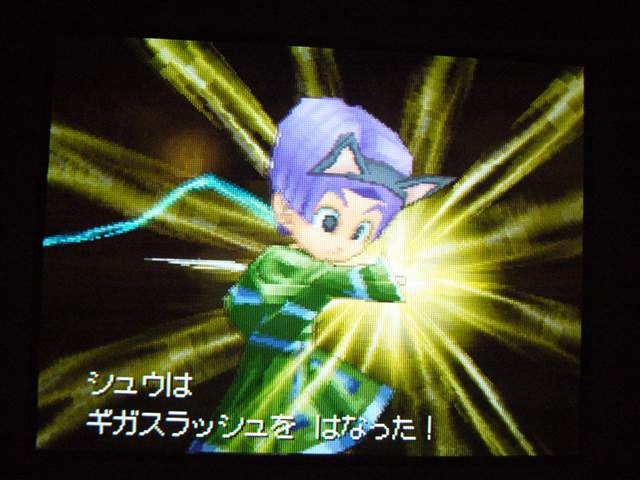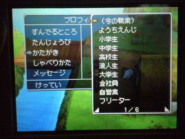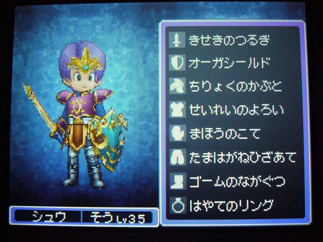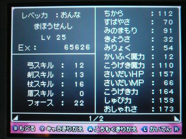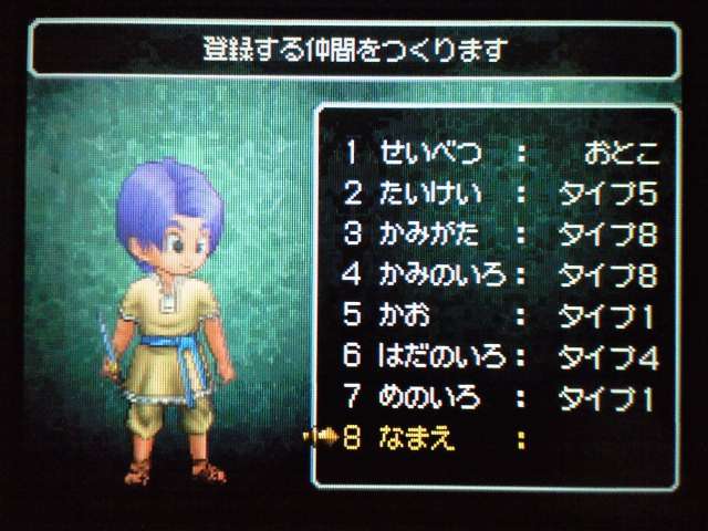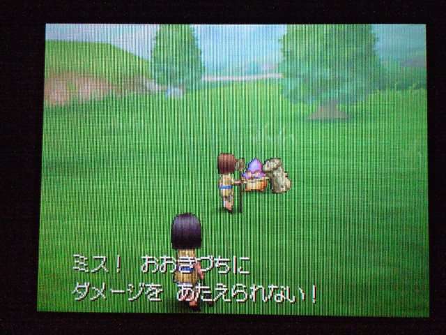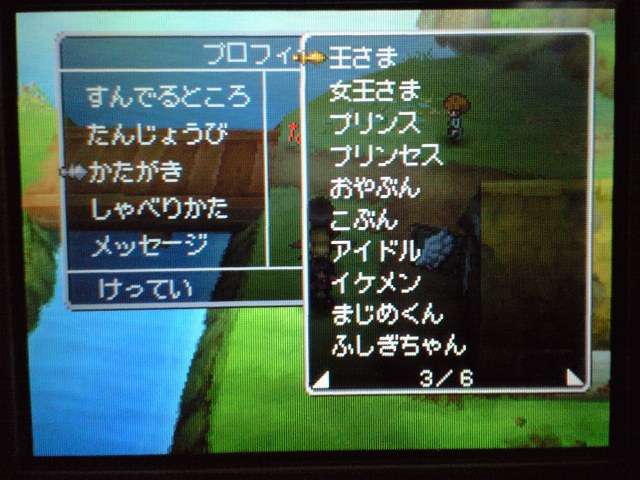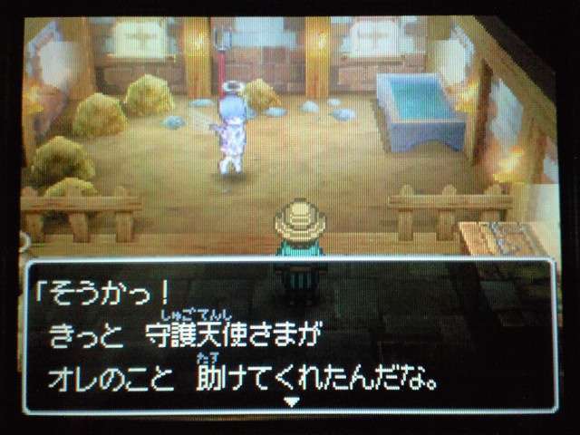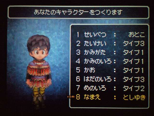お店では 列が出来ていましたよ。 早速名前登録。 ていうか ここまで来たら もうキャラメイク! 体格・目・髪型やら、わりと細かく設定可能。 4以来久々に男女の選択も可能。 そして、名前も5文字まで入力可能! イベントもポリゴンで。 表情などが 細かくハッキリと出ていて、よくできています。 時折アニメムービーも挿入されるけど、 それもまた 力が入っている・・・ そういえば7のCGムービーは・・・(略) その他の人はドット絵。遠めで見れば それほど違和感はなし。 でも主要キャラはポリゴンで描かれてます。 主人公は天使で、人間の感謝の気持ちを 世界樹にささげるのが お仕事なんですが・・・ そんな天使さんが こんなことしていいわけ? もはやシリーズ恒例となった「うまのふん」。 4コマ劇場では よくネタに使われていたり、 前作では いろんなふんが登場して、チーズの材料になっていたり・・・ この馬小屋では たくさん落ちているけど、全部拾うと・・・ 小屋主に感謝されました。 ていうか これが師から独立してからの初仕事になってしまいました。 いやいや、こういう積み重ねが 立派な天使へと成長していくのです。(?) 手前向きでない扉でも、扉の前に立つと「!」が出てくれるから便利。 調べられる物や、話しかけられる人の近くに立つと、フキダシが出るように。 ほうほう、ツボやタルやタンスの中身は変わるのか・・・ ていうか、それって家捜し公認ですか? 突然婚約者の家におじゃまして、タンスから ちいさなメダルを失敬するのも 許されるというわけで・・・? それなら 気兼ねなく できちゃいますね。 通信プレイ時の公開プロフィール設定。 ドラクエらしからぬ、シュールなものや、ヘンな肩書きまで・・・ 個性ゆたかな自分が演出できそうです。 エンカウントがシンボル方式に。 複雑さを省くために、接触のしかたによる バックアタックなどはないもよう。 しばらくゲームを進めて ようやく仲間を作れるように。 ていうか ある意味これが最大の難関かも。 なにしろ 公開覚悟で はずかしくない名前を考えなくちゃいけないし、 なんかカッチョエー名前ないかなぁ~ と悩んでいるうちに 2時間も過ぎちゃったりして・・・ あらかじめ3人が登録されているけど、やっぱり自分で作ったキャラのほうが そりゃあ愛着もわきますし、時間をかけて じっくりと考えたいものです。 バトルも よく動きます。ミスっちゃってますね。 とくに4人パーティを組むと、4人が ちょこまかと動き回って楽しい。 装備品が グラフィックに反映されているのも うれしいし、 着せ替え気分で装備の変更が行えるのもいいです。 でも この頃はまだ出来たてホヤホヤなので、服装が みすぼらしいです・・・ システム面は基本から磨きがかかったもので、まさに自分の好みだし、 グラフィックの面でも 力が入っている。 携帯機であることに懸念し、据置機がいいというのも よく聞く意見ですが、 いくら高性能のゲーム機を使っても、ドラクエの雰囲気を出すにおいては、それは不要なもの。 その人たちは ドラクエに一体なにを望んでいたのだろう。 ドラゴンクエストは 主人公になりきり、冒険を楽しむという、 本来のあり方を ずっと忘れてはいない、数少ない王道RPGだと思う。 映画的だの、豪華だの、付加価値に頼るような事なく、それをずっと守り続けていってほしい。