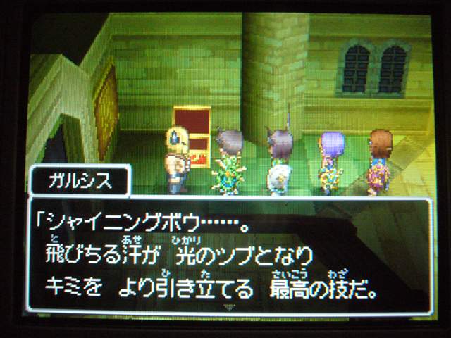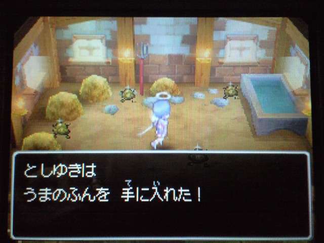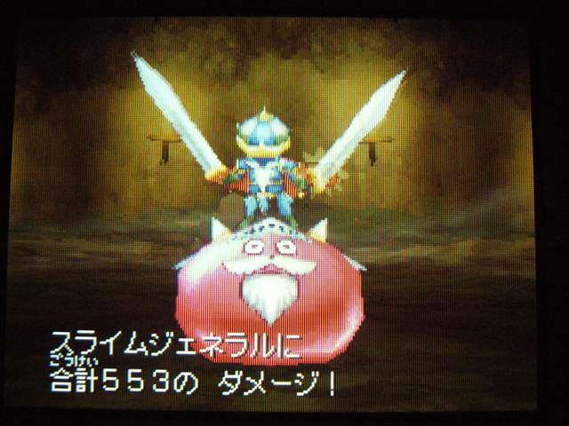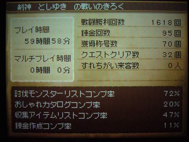 もちろん その後のオマケがあるのは当然なのですが、 今回は 魔王を倒す直前から始めて、ちょっとオマケダンジョンがありますよ~ みたいな進行じゃないんです。 クリア後も ちゃんと魔王を倒した後の展開になっていて、 それから クエストなり宝の地図なりを攻略していくという事になっています。 これがクリア直後の記録。戦闘勝利回数が かなりの数です。 なにしろ 一度も逃げずに戦ってきましたからね。 この装備で挑みました。やはり最後までネコミミ・・・ この子にも剣スキルを極めてもらったのですが、 そしたらギガスラッシュを使いまくってくれるんです! 6や7までは ちっとも使ってくれなかったのに・・・ 敵を一掃してくれるのは いいのですが、 道中使ってばかりでは、当然ガスケツになってしまうもんです。 というわけで、歩くとMPが回復する 女神のゆびわを装備させています。 旅芸人も けっこう面白く意外と実用的な特技があって、 このキラージャグリングでは・・・ こんなダメージを与えられることも・・・ スライムジェネラルも カードから本編へ進出ですね。 宝の地図ダンジョンのボスですが、 スライム族にそぐわぬ、ダークなセリフに驚いた。 そのほか・・・ 魔物がいるのに こんなところで放牧していて大丈夫なのか? 沼の外に立てておかんかい! と、ツッコミたくなる看板。 身をもって勉強しようってことですね。 浴場で「ねる」しぐさ。おぼれませんか? 「マリオ64」でも 岸辺ギリギリで放置して 水中で いねむりさせていたものです。 シャイニングボウって、こんな技だったの!? ククールさん、どう思いますか?