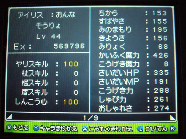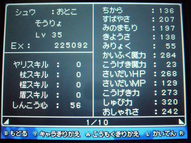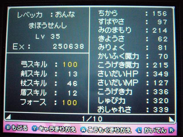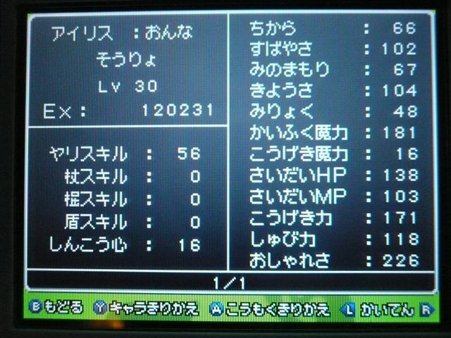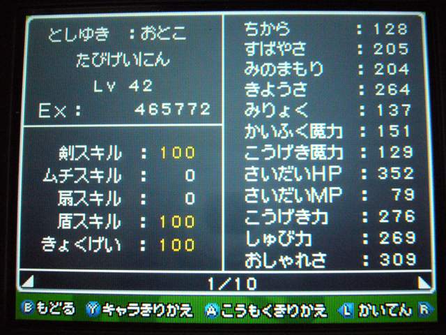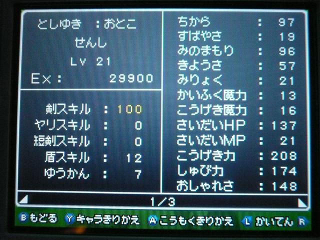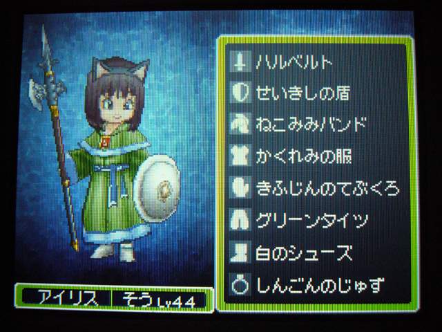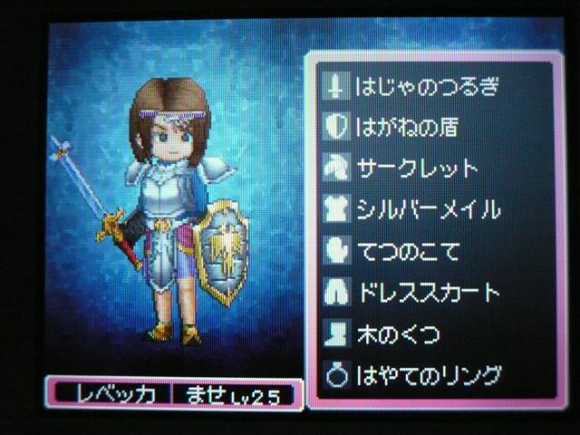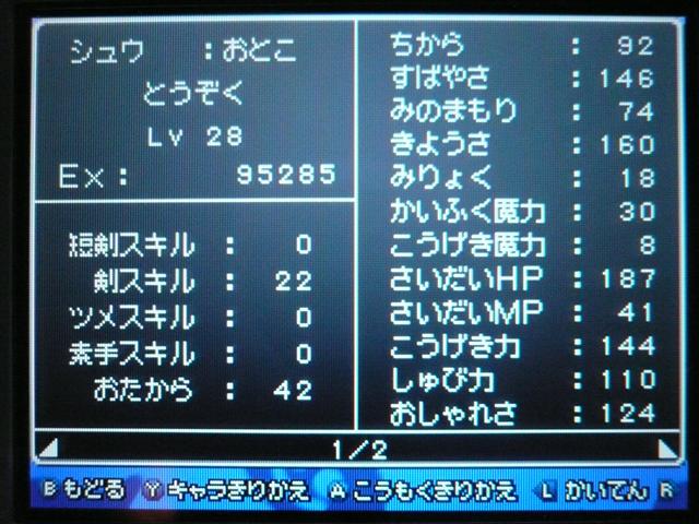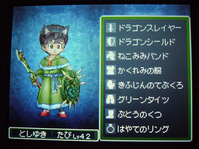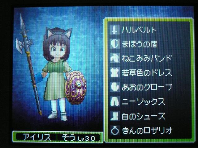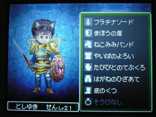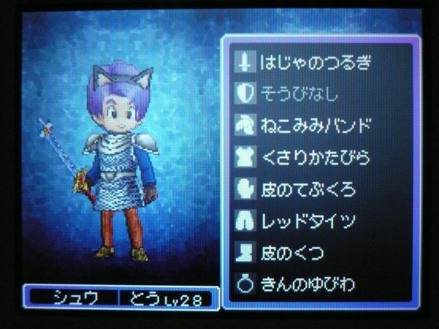 それはさておき、ドラクエ9も けっこう進みました。 今回は大筋を追っていくのではなく、所々に点在するストーリーを消化していくという形で、 場所移動にも自由度が高く、冒険が楽しいです。 今回は 現時点でのパーティ紹介。 最初に登録した仲間。 盗賊から始めているので、戦闘では メタルスライムよりも先手を取ってくれるほど。 攻撃面、やくそうを持たせた先手の回復が心強い。 扱いやすい剣スキルを重視。なぜかネコミミをつけています。 しかし、イマイチ装備の貧相さが否めません。ゴメンよ。 2番目の仲間。一番ネコミミが似合う子になりました。 回復がメイン・・・なのですが、戦士にひけをとらない活躍を見せてくれます。 まだ一度も転職してません。 3番目の仲間。元魔法使い。 魔法戦士にしてみたけど、攻撃呪文は 覚えないのね。 いずれ弓をマスターしてみる予定。ネコミミも つけたほうがいいのかな。 最後にマイキャラ。 さっきまで旅芸人だけど、とある事情から戦士に。 なぜかネコミミが気に入ってしまったので、つけてます。 しかも やいばのよろい とですか・・・ 剣スキルが100いってますが、少々力ずくで育てました。 というのも、振り分けられていないスキルポイントや、共通するスキルは全職業共有なので、 それを利用して、3職業をレベル20あたりまで育て、ムリヤリ スキルポイントを集めました。 レベル上げポイントは、ベクセリア北西のほこらで、たまにメタルスライムが出るので、それで稼ぎました。 3人がメタル斬りを習得しているので、メタルスライムも 案外逃げにくく、楽勝! 2時間ほどで めでたくギガスラッシュを習得! ギガスラッシュの威力は 200近くと絶大!! しかし、消費するMPも15と膨大で、戦士とかじゃ ロクに使えませんなぁ。 というわけで、今度はMPの高い魔法使いなどに転職する予定。 全職業で剣を使えるようになり、ギガスラッシュは特技なので、 当然 魔法使いでもギガスラッシュは使えます。 そして、最大MPが増えるように、スキルを上げていく予定。 しかし、こんな早くから これ使えるようになって いいのかな・・・