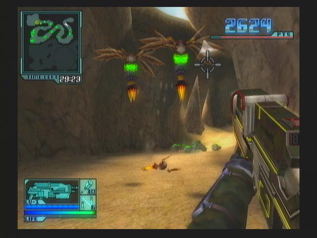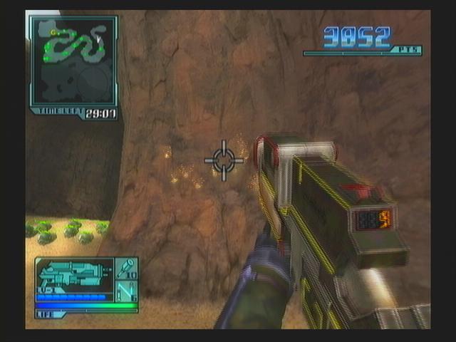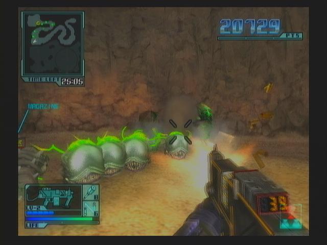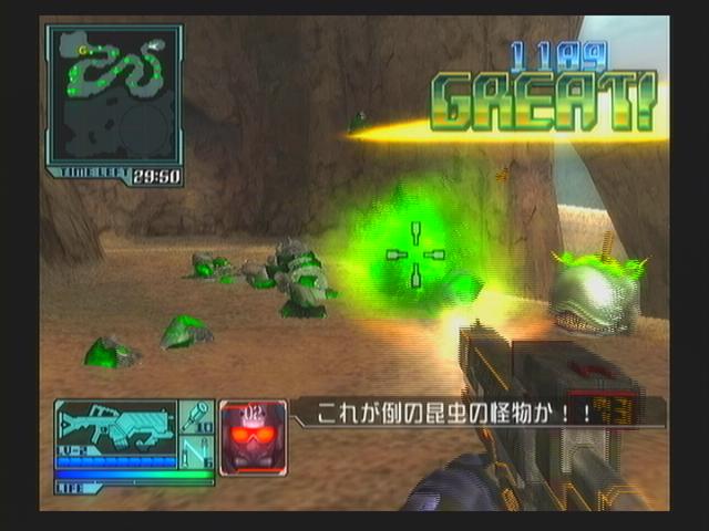 「マッドセクタ」というゲーム。 こんな巨大な虫と戦うわけなんです。 昆虫にも いろいろあります。 これはハチ。小さくて当てにくいので、 ショットガンを使うのがいいかも。 でも仲間は 妙にうまく当ててくれますが・・・ ためしに壁に撃ってみると・・・ どうやら横に広がるタイプのもよう。 ロケットランチャーなんかも あります。 ホーミング弾なので、遠くの敵に ブチこむのもいいですね。 爆発性もあるので、その周囲の敵も巻き込めます。 時には こんなにうじゃうじゃ出てくることも・・・ そんな時はマシンガン! でも威力は弱めなので、弱点を狙うのがベスト。 このイモムシの場合だと、上の緑の部分が「核」なので、 この高さに合わせて 横に流れるように撃てばバッチリ! すべての昆虫には弱点である「核」があり、 そこを狙えば 大ダメージを与えられ、倒しやすくなります。 しかし、それが後ろ側にあって 狙いづらいことも・・・ 特攻マシン BKD-G9。こんな乗り物もあります。 ガトリングガンを爽快にぶっ放せ! 弾切れになったら そのまま轢いてやるといいです。 ほかにも近接戦闘用に 硬い敵でも平気で引き裂いてくれるビームウィップや、 グレネードも ちゃんと備わっています。 これらはヌンチャクを振って操作。それっぽい操作感がいいです。 とくにビームウィップは 敵に近づかれた時に振り回すのもいいですが、 硬い敵や巣もカンタンに倒せるので、思い切って近づいて使うのもいいでしょう。 敵やマップに使いまわしが目立つものの、 それを補って うまく配置されているし、 ただ倒すだけでなく、拠点の防衛、目的地への到達など、ミッションも多彩で、 なにより無数の敵を倒していく爽快感はバツグン! 1000円で この内容はスゴイです。 でも、難易度も すごいです。 ノーマルでも何度やられたことか・・・ 手軽に遊びたいのなら イージーを選んだほうがいいでしょう。