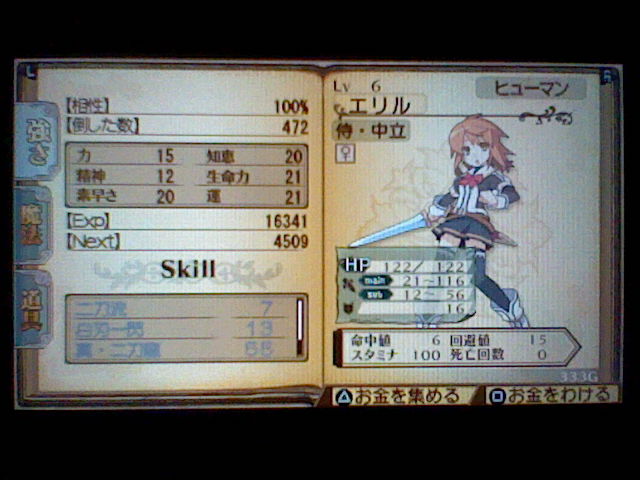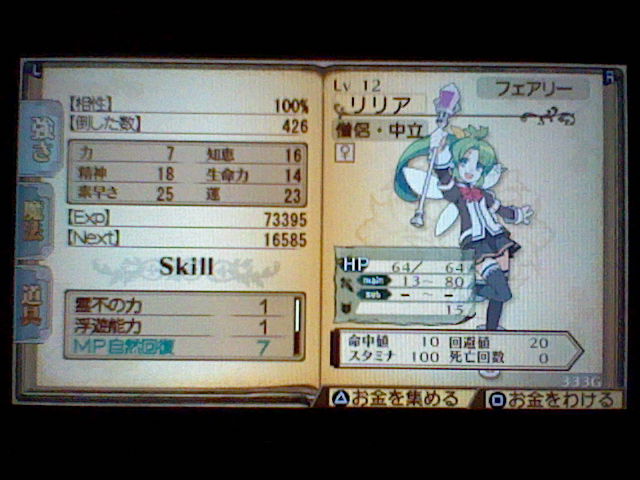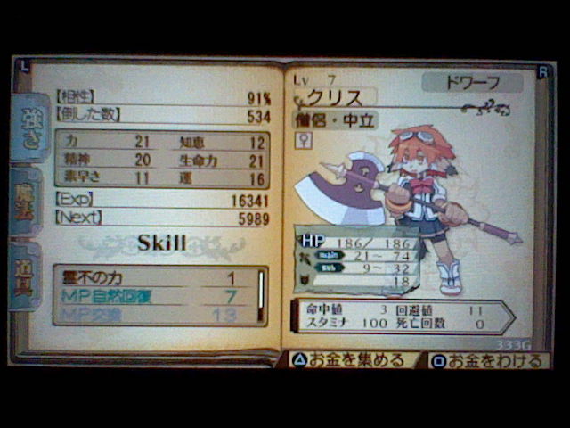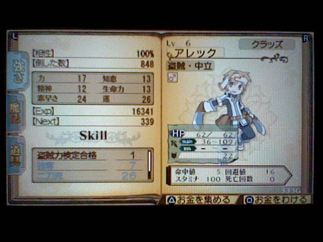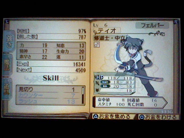 いろいろ模索しつつ、あらゆる方法で あれこれして、復帰に成功。 なにを血迷ったか、DSiカメラで撮影。 日本橋のとあるパソコンパーツ店で、売ってたんですよ・・・ 悪魔が封印されたあの箱が・・・ んで、それを利用して・・・ あれこれして・・・ とにかく復帰したんですよ。 友人は SCEに修理に出すのも嫌っていて、 新型PSPを買った友人からは、それはもう好きにしてかまわないと言われたので、 自分が ありがたく使わせていただいております。もちろん 要望があれば返すつもり。 で、やっぱりソフトがないと 楽しむにも限界があるわけでして・・・ 「剣と魔法と学園モノ。」というゲームを買ってきました。 友人が遊んでいるのを観て、これイイなと思ってたわけなんです。 ちなみに最後の句読点「。」も忘れちゃいけないんですよね。 現在のパーティ・・・ 前衛チーム 2009年4月1日現在・・・ 元は戦士です。とりあえず転科(転職のようなもの)がしたくて、 この学科(ジョブのようなもの)に転科しました。 ネコミミいいですね。単にネコミミをつけてるのではなく、 ちゃんと獣人であるという部分が・・・ 正直 ネコミミメイドさんよりも こっちの方が好きなんです。 ちなみに名前は ポケモン ダイヤモンドのオスのコリンクにつけていた名前からです。 彼女は盗賊でした。 そして狩人に転科できるようになったので、それに。 そして 現在に至る。 元戦士。元が戦士系の種族のため、 僧侶にすると けっこうバランスいいです。破戒僧? 後衛チーム 2009年4月1日現在・・・ この子が いちばんお気に入りだったりする。 元は戦士で前衛をやらせていましたが、 盗賊が適正のようで、盗賊もほしくなってきたので、盗賊に転科。 現在は 弓矢で後方支援中。 名前は ポケモン ダイヤモンドのオスのブイゼルにつけてた名前から。 ちなみに このブイゼルの性格は「おくびょう」なのですが、 この子は どうなのでしょうかね・・・ かなりモロいけど、後方で がんばってます。 すばやいので、戦闘中の先手回復の信頼度が 非常に高いです。 僧侶の特性からか、ぱちんこを持たせたら、 幽霊系を一撃で仕留めてくれるなんてことも ありますが。 後に錬金術師にする予定。 マッドサイエンティストを意識してみてか、性格は「悪」に。 でも、力が足らず、なかなか転科できません。でも がんばる。 ちなみにフェアリーって 同種族で相性が悪かったんですね・・・ まぁいいか。 相性とか適正とか、そういうのは考えていないです。 キャラクターは数字じゃないですからね。 前に とあるポケモン攻略サイトでも、管理人さんのコラムで、 「ポケモンはキャラクターの皮をかぶった数字なのか」と疑問の文があり、 自分も それには同意。 ゲームのプログラムは数字だけれども、その数字で遊ぶためにゲームが作られるんじゃなくて、 物語や冒険を表現するために 数字を使って作っていると思うんです。 だから数字は あくまでもスカウターで表示された戦闘力って程度に観て、 そのキャラクターを ちゃんとキャラクターとして面倒みてやろうと思っています。 変に方向が変わってしまいましたが、 このゲーム、シナリオは勝手にやってくれみたく、けっこう無責任ではあるのですが、 むしろ それのほうが自由度が奪われることなく、 手探りで進んでいく感覚が楽しめます。 意図的に不親切にしたのか、親切すぎない部分がまた、 束縛感を感じずに遊べるのが いいですね。 PR