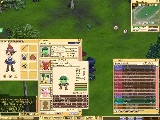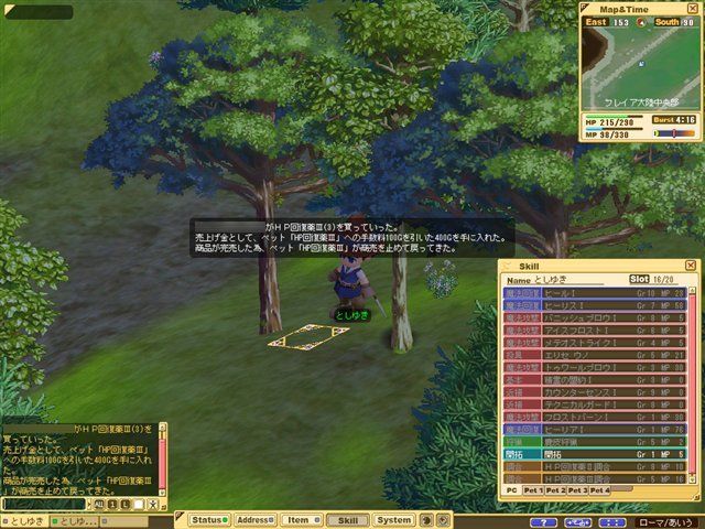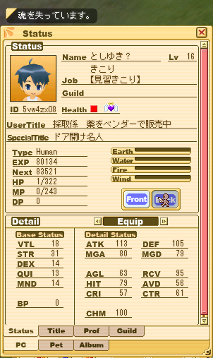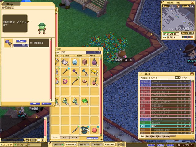 プレイステーション2を持ってきた。 おばさんは機械については 詳しくはなく、 とりあえずこれでDVDが観れると言われて受け取ったらしい。 しかし、コントローラがなかった。 なるほど。これじゃあ操作は できないですね。 こちらもPS2のDVDビデオ再生機能は使った事がなかったうえ、 型番まで違っていたので、とまどいながらも とりあえず基本的な操作や設定を教え、 ゲームは遊ばないとの事なので、 DUAL SHOK2じゃなくても問題なさそうなので、 今は使っていない、PSone付属のコントローラを渡した。 それにしても、なんでコントローラを渡さず、 本体だけ渡したのだろう(映像ケーブルは あったけど・・・)。 もしかしてPS3で使うためだろうか。 しかし、光学ドライブに問題があるらしいSCPH-35000にも関わらず、 なんの異常も見せず、DVDビデオを再生していた。 ディスク自体が片面2層じゃなかったのも あるかもしれないけど。 しかし本体の外装も きれいだったし、 さほど酷使されていなかったか、 よほど丁寧に扱われていたのかなとは思った。 ぎゃーーーー! カモミールを採取で放置してたら、 いつのまにか魂が抜けてしまっていました。 こんなことは初めてなんで 驚きました。 しかし、普通に戦うことは できるようです。 能力は大幅に下がるようですけど。 前に重症で留まったことがあったけど、 その時の治療費は かなり高額だったからなぁ・・・ 今回は なおさら・・・ ・・・と思っていた矢先、突然思い出したのが「治療I」スキル。 たしかこれって 薬剤師が覚えられたよなぁ。 そう、覚えられたんです。 急遽城の聖堂へ向かい、スキルを購入。 どうにか一命を取り留めました。 いやぁー、薬剤師でよかったぁー。と思った瞬間でした。 この後の「重症」を治して今はGr3。 意外と上がりやすいんです。 一応、「応急手当」のスキルも購入。 しかしこちらは 消費がデカい。 これなら薬を作って その場で使ったほうがおトク? とうとう買えました! ベンダースキルです。 最初は防具作っていたけど、やってる人がいたので、 材料入手にも それほど手間もかからず、 消耗品である薬を作ることにしました。 薬を作っては開拓で埋めを繰り返し、 コツコツと貯めました。 「ペットアイテム持ち」と「ベンダー」スキル。 合わせて6万G。めっちゃ高いですよね。 んで、さっそく配置と・・・ ちょっとこの価格設定、高すぎかな・・・ 後になって そう思いました。 でも買ってくれる人がいました。 ホンマ こんな高いもん買わせてしまって えろうすんません。 今後 勉強させていただきます。 一応 名前は伏せておきます。 ホントに買ってくれて ありがとうございます。 しかし、採算を取ることも必要なので、 ★が多いものを売り、★が少ないものを 開拓で埋めていくことにしました。 手数料取られるけど、利益よりも買ってくれるのが なにより うれしいね。