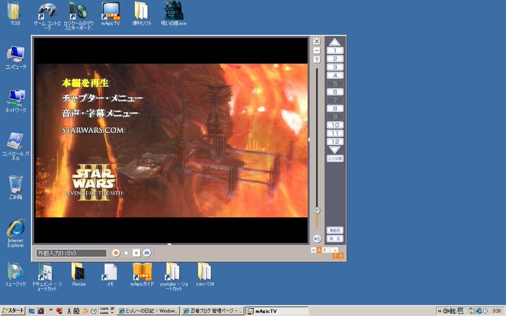 ネタになってたよりも エアーマンは簡単に倒せました。 それよりも、特定の攻撃で回復するボスがいる事に ちょっと驚いた。 かなり難しいけど、手応えはバツグンでした。 またエレコムわけありショップでお買い物しちゃいました。 今回はゲームパッドばっかり。 他はデジカメ用AVケーブル3本とUSB2ポートハブ2個。 写真には2本しか写っていませんが、デジカメ用ケーブルは3本買いました。 なにしろ100円だったし。 本当はコンバータを使って、PS2用、GC用コントローラを使った方がいいんだけど、 色々使ってみるのも いいものだと思って こんなにも買っちゃいました。 ここでのお買い物も好きだし。 とりあえず、PC版ロックマンX4で使い心地を試してみました。 シルバーとブラックの2つ買っちゃいました。 ボタンの押し具合もよし、裏にはグリップとなる ふくらみがあり、 割と安定した操作が可能。なかなか気に入っています。 某ブーメラン型コントローラを彷彿とさせるデザイン? 妙な形ながら 滑り止め加工がされてあるので、安定はします。 しかし、その滑り止め加工がアダになったのか、 背面のトリガーボタンが その滑り止めに邪魔されて 引っ込んだままになってしまう事が多いです。 中央にあるのはアナログスティック。 うちにあるUSBゲームパッドで 現在唯一アナログスティックのある機種ですね。 中央に配置されてあるので どちらの手でも使えるのは強みでしょうが、 親指を ほぼ全力で伸ばさないと扱えませんし、 なによりスティックが滑ります。これにも滑り止め加工をしてほしかった。 形が某ゲーム機に似ている? 角ばっていながらも グリップはいいです。 特に突出した部分もなく、無難な感じかも。 これは扱いやすいです。 グリップは しっかりしていて、ボタンの押し心地もよい。 「PS系ボタン配列」と書かれていますが、 右側のボタンは メガドライブやセガサターンを 思い出ださなくもありません。 方向キーが傾いているように見えますが、 実際にはけっこう正確な入力が可能です。 しかし、これもまた滑り止め加工が原因なのか、 先ほどのブーメラン型よりはマシですが、 ボタンが若干戻りにくくなっているような気がします。 いずれのゲームパッドでも ロックマンX4の最初のステージは 問題なくクリアできましたが、 やぱり一番扱いやすいと思ったのが 最初のものですね。 しかし、最も扱いやすいパッドを探すよりも、 扱うこと自体に面白みを感じるので、 気分次第でゲームパッドを変えるのも楽しみです。 それにしても USBゲームパッドには実に個性的な形の物が多いです。 使いやすさを考えられてあるかは 疑問に感じることはありますが。 Wiiでも USBゲームパッドが使えたらなあと思ってたりもします。 数ヶ月前に プラグ部分が断線し、 バラバラにしてしまったI-O DATAのビデオキャプチャカード GV-MVP/SV 付属のAVケーブルの修理に成功しました~~~!! ビニールテープで無骨そうに巻いていますが、 それでも しっかり映ります。 ダイソーのヘッドホン延長ケーブルを切って使い、 中で半田付けしました。 今まではプラグとパーツの距離が短く、 浮いている箇所では ぶら下がった状態になって 負担がかかっていたので、長めにしてみました。 継ぎ足したケーブルも やわらかいので大丈夫でしょう。 2011年にアナログ放送は終了しても、 AV入力機能を使う上では 関係ないのです。 ホラこの通り、DVDもしっかり映ります。 ムスタファーの奥に ベイダー卿の姿も うっすらと映っています。 え? DVDならパソコンでも再生できるだろうって? いや、これはあくまでもテストなんです。 でも、パソコンではドルビーデジタルが使えないので、 光デジタル端子のあるDVDプレイヤーを使う場合もありますが。 にしても、このシーンをメニューに使っていいのだろうか・・・ 設定画面では一部分とはいえ、 アナキンとオビ=ワンのラストバトルのシーンが使われてるし。 一時はI-O DATAから部品注文を考えていたけど、 このケーブルは リストになかったし、 ヘタすりゃ もう1つキャプチャーカードを買うなんて事も考えてた。 まぁともかく、治ってよかったですわい。