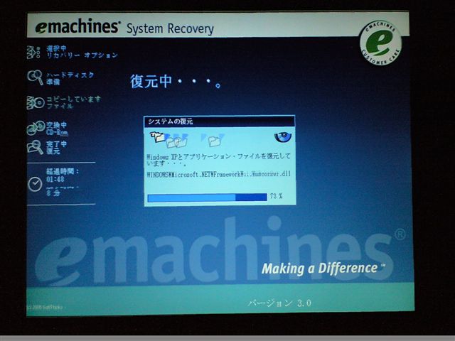 再起動しても なかなか立ち上がらず、 黒い画面で縦線カーソルだけが出た画面で止まっていた。 電源を入れなおしたり、デバイスを外したりで だましだまし やってみて ようやく起動。 あるアプリケーションをインストールし、 再起動を要求されたので恐々やってみたら 案の定。 「windowsを起動できませんでした」どうたらこうたらの画面になり、 「セーフモード」や「通常起動」やら選択しても 一向に立ち上がらず。 昨日はそれで てんてこまい。 リカバリしたくてもそのディスクも失ってしまってたし、なすすべなしかと・・・ しまいには パソコンの買い替えまで考えてしまったほど。 しかし、一瞬表示されてた「(何かの英文)F11(英文)」が気になり、 とりあえずF11を押しっぱなしにしてみたところ・・・ ななんと!リカバリ画面が出たではありませんか! まさに天の助け? これで再起動地獄から抜け出せるかもしれない。 ちょいと惜しいデータは あるものの、 パソコンがまったく使えなくなるよりは ずっとマシ。 迷わずリカバリしちゃいました。 まさか こんな方法で初期化ができてしまうなんて・・・ リカバリ後は 動作がめっちゃ軽くなりました。 これぞ心機一転ってやつ? コンチェルトゲートは ノートパソコン(Vista)の方でも 人が少ない場所なら なんとか出来るから このパソコンが動かなくなっても ノートでガマンしようかなとも。 お気に入りのテレビキャプチャ GV-MVP/GX2W がまた使えるのもうれしい。 軽くなったついでに 処理落ちで音声が時折遅れる いっこく堂状態も解決できればいいなと思ってたりして。