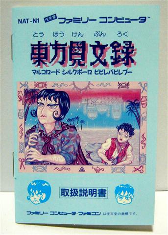 れっきとしたゲームのタイトルです。 ナツメから発売されたファミコンのアドベンチャーゲーム 「東方見文録」。 バカゲーサイトを回って 偶然見つけて魅了されたこのゲーム。 オークションで3000円で落札しちゃいました。 運よく説明書も箱もついていました。 「東方見 文録(トウホウケン ブンロク)」とは、主人公の名前。 東方見聞録の世界で ブンロクがメチャクチャやらかすアドベンチャーゲームなのです。 説明書の表紙からしても これですからね。 しかしバカゲーでありながら、よく出来ていると思いました。 不出来な物と思ったら、案外よく考えられていて、 最後までテンポよく進められました。 そして 予想外にも面白かったので、 とりあえず特集ページを作ってみたりもしました。 |