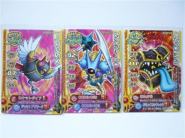 ついに第4章が稼動しましたね。 先日思い切ってレンコ※しちゃいました。 ※「連コイン」 硬貨を積み上げて、連続でゲームプレイをする事らしい。 私は「連続購入」の略かと思ってました。 このゲームの場合 ゲームプレイなしで カードだけを連続で買う事なので、 あながち間違ってないかも。 ついに手に入れた!! ドラゴン斬りとステテコダンス。 前から欲しかったけど、全然出なかったんですよね。 ギガスラッシュも復活したようで、 3章から廃盤になったと なげいていた人には朗報ですね。 私ももう1枚予備が手に入ると思うと うれしい限りです。 ギガデインと水のはごろも? それはそのうち出てくるでしょう。 新モンスター メタッピー キラーマシン2 パンドラボックス まだダブルスキャンは できないものの、 いずれは使ってみたいモンスターです。 特にパンドラボックスは 合体しないほうがよさそうな気がするほど・・・ 他の人たちも 新章のレンコに精を出していたようです。 ほとんどの人は 黒いカードが出るまで買うので、 お小遣いが少ない人は 今は普通に遊び、 しばらくして熱も冷めたころに 1日500円くらい使うのがいいでしょうね。 私が見たところ 黒カードは20枚弱くらいの間隔で入っているようです。 そして今回気に入ったのは、このスライム。 背景とレイアウトのシンプルさが、 スライムをより引き立てているようにも思えます。 絵柄は使いまわしかもしれないけど、 そうであろうと 妙に気に入ってしまった1枚です。 今回は新章のカードが欲しくて ほとんどカード購入だけになっちゃいましたが、 次はまともにプレイしたいところです。 最初のプレイでは ドルマゲスと戦えました。 しかしHPは増えているもよう。 次にラプソーン戦があると思い、ゆうきを使わずためたまま倒しましたが、 どうやらラプソーンは いないようです。 スーパーキラーマシンというのが ボスのようですね。 スライムだらけ~~。 じつはこれ買ったわけでなく、クレーンゲームの景品です。 いつもバトルロードをやっている行き着けの店で、 これが景品として使われているのです。 小さいスライムは600円、大きいのとバブルスライムは1200円です。 なので多少失敗しても ソンではないわけですね。 でも ちょっと高いとは思いますね。 もう少し値下げなりませんかね、スクエニのダンナ。 と言っても 質はとてもいいんですけどね。 商品の札で ひっかかっています。こんな事もあるんですね。 ここから落とすのに なぜか300円かかってしまいました。 結局は本体狙いではなく 札に触れて落としましたが。 しかし最近のクレーンゲームのハンドは弱すぎる! あまりに弱すぎて もはやキャッチするのではなく、 転がしたり ひきづり落としたりするのだから困る。 ところで みなさんは3番のボタン使っていますか? 見ていると 使っていない人が未だいるようですが、 あれは高さ調節のボタンで、ハンドの力は 景品に触れた所で調節されるようなので、 高さ調節のボタンで よけいな景品で力が奪われないようにする事ができます。 と言っても それでも力が弱かったりしますが。 取れそうで取れない絶妙なバランス調整は 見事とはいえますが、 アコギな商売とも言えなくもないかも。 もうちょっと 扱いやすいハンドでもいいと思うのですが・・・