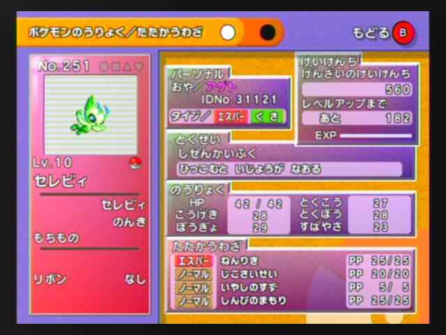 ポケモンレンジャーと蒼海の王子マナフィ これを観に行ってきました。 今回の映画は ずいぶんと大冒険だったわぁ。 ハルカのおかあさんっぷりや サトシのド根性にはシビレました。 ああでも、あんまり言わんほうがええかなぁ・・・ネタバレになるし・・・ ともかく、その帰りには当然「ポケモンレンジャー」の Wミッションを引き換えてもらうため、ポケモンセンターへ。 すると思わぬ大収穫! その隣りでセレビィのプレゼントまでやっていたのだ! 最近そういう情報見ていなかったから、驚きだった。 じつはポケモンコロシアムの拡張ディスクはあったのだが、 やっぱりIDもちがうし 記念にもらっておこうと思った。 そして スイートピーの花の種ももらった。 左が今日もらったセレビィ。右がコロシアムの拡張ディスクのセレビィ。 おやが「ミツリン」さんですね。どこの密林に住んでいるのでしょうか。 で、Wミッションとセレビィをもらった後 交換を持ちかけられてきたが、 その人は なにを要求するやら、色ちがいのポケモンを交換してほしいと言う。 色ちがいのポケモンと言えば たしか1/8000あたりの確率で出てくる レア中のレアなポケモンなのに、それをくれと言われても・・・ そのほか 伝説のポケモンや「でんきだま」まで要求してくる・・・ でんきだまと言えば ルビー・サファイア・エメラルドで 超低確率で野生のピカチュウが持っているか、 ポケモンコロシアムの拡張ディスクで コロシアムのクリアデータで 1度だけもらえる。 当然 そのような貴重なポケモンやどうぐを交換に出したくないため 交換しないまま交渉は終了。 その後 その人を見てみると、何度も繰り返しセレビィをもらっていた。 受付の人は 何度でもくれるとは言っていたが、 さすがに自分は繰り返し何度ももらう気にはなれない・・・ でも 後ろに人はいなかったので、もう1度だけ各カートリッジ(5本)に 1匹ずつ 最終的に計6匹もらうことにした。