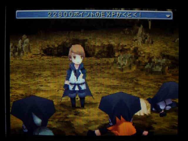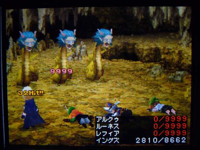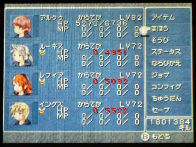 アルクゥただ一人が生き残る。 はたして 一体どんな強い敵と戦っていたのだろうか・・・? いえいえ、ちがいますがな。 やられていない仲間の分だけ 経験値がふりわけられることが解ったので(今頃・・・)、 こうしてアルくん以外の人達には ぶっ倒れてもらっている次第であります。 なぜアルくんかって? そりゃあアレでしょう。好きだから。そんだけ。 で、現在こんな状況。 一人だけひたすら強くたくましく育っています。 村で過ごしていた時は、ルーネスくんに守ってもらってた弱虫くんが、 今ではこんなにたくましく・・・ でも、HP9999行くかは ちょっと心配・・・ ジョブが空手家なのは このジョブが最も「たいりょく」が高いため。 「たいりょく」はHP上昇率にもなるため、このジョブでレベル上げするのが最適なのだ(と思う)。 空手家には「ためる」があるけど、ためすぎると爆発してしまうのよね。 普通なら「もう効果はない」などのメッセージが出るけど、 ドカンと行ってしまうという発想がたまらん! センスよすぎですよ!! 「ためる」3回目にドカンと行く。そしてそのダメージは 現HPの半分。 つまりはHPが半減しちゃう(小数点以下繰上げ)のだ。 通常攻撃でも9999のカンストダメージ行くのなら、 「ためる」は必要ないのでは?と思ったのだが、 実は 9999と表示されるだけで 本当は1万以上ものダメージを与えているらしい。 これなら「ためる」の存在意義もありますな。 それと今頃気づいたんだけど、空手家は武器を外しているほうが強い! 最強のナックルを 両手に装備している時よりも 1.5倍くらいか強かった。 さすがは空手家!! アルクゥくんの場合は 現段階で334! パワフルです! これなら瓦どころか レンガだって粉々ですな。 村に戻っても もういじめられる心配もないでしょう。 4人で戦っても 最終的に戦う回数は一緒なんじゃないのかって? いえいえ、まずは1人を育ててみたいわけです。 HP9999になるのを 早く見たいものでしてね。 アルくんのレベルが99になったら 今度はアルくんが倒れてもらう番ですけどね・・・