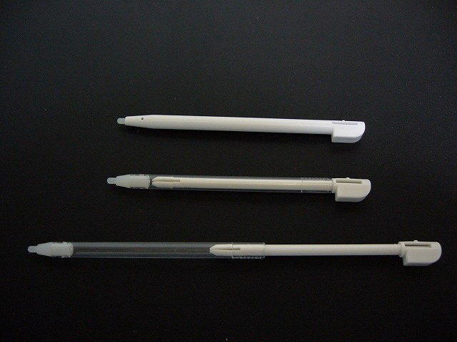 「タッチペンロングDSlite」っていうの。 一番上が純正のタッチペン。 下2つが ホリのタッチペン。 前回の旧DS用の「タッチペンDSロング」は かなり「ぐにゃり」と曲がって困ってしまったが、 今回は もとが太いこともあってか、かなり安定していて使いやすい。 本体にはめた感じも 純正のとほとんど変わりないし、 値段も400円だし、なかなかいいかも。 しばらくお気に入りとして ワシのDSliteに搭載しておくことになるだろう。