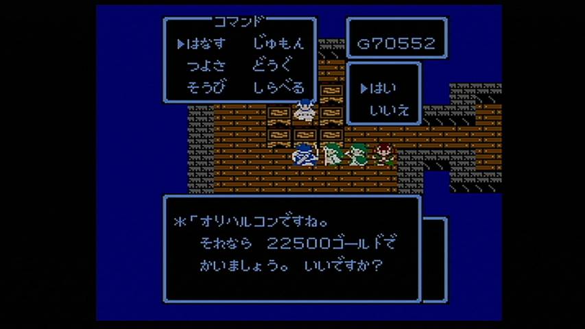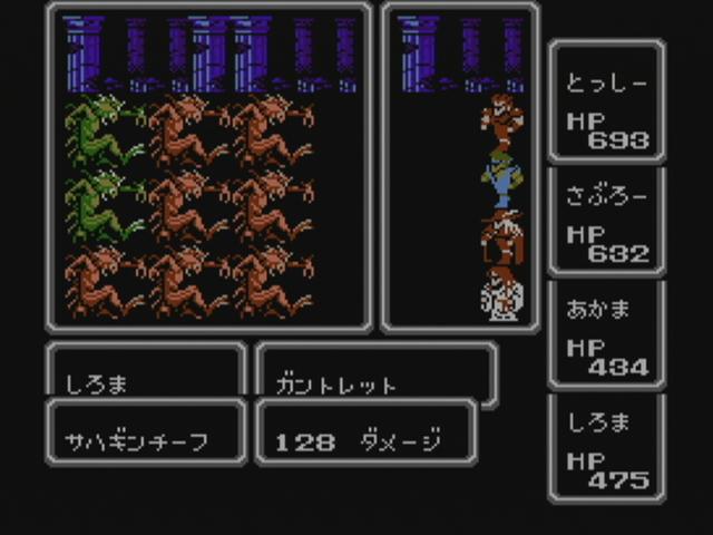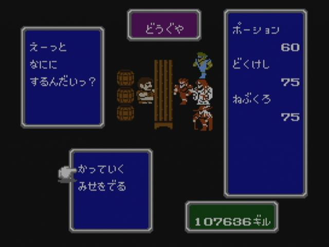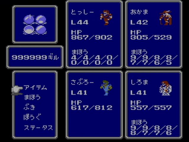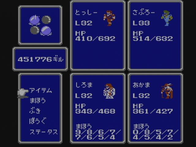 長い長いたびの末、ようやくクラスチェンジできました!! ていうか 怖すぎるよ コイツら・・・ ナイトなんか もはやケンシロウだし・・・ 店に入ると おだやかな感じに見える店主とのギャップの差を感じ、 なんだか威圧感さえ感じてしまうくらい・・・ 勝利時のポーズも ナイトなんかバンザイしちゃったりしてますし。 後のFF3で ネコミミの導師がある事を考えてみると、えらい違い。 なんだか別のゲームになったみたい・・・ クラスチェンジ後の強みのひとつとしては、 ようやく テレポ(ダテレポ)を習得できたこと。 これによって ダンジョン探索に安心感が持てます。 強さの点では体感では 感じられにくいけど、 モンクなんかは 1000ダメージを平気で出すほどの 本当に スーパーなモンクへと成長を遂げます。 魔法が回数制。それならまだいいのだが、 今作は その回数は1ケタ。つまり 1レベル最高9回まで。 なので ザコにバンバン使ってたら MPが足りません。 というわけで、そんな状況で便利なのは 道具として使える装備品の存在。 そのひとつとして ガントレットは サンダラの効果があり、何回でも使える。 それを白魔道師に持たせれば 準白黒魔道師に・・・ つまりは 白魔道師にも 攻撃面で活躍させられるスグレモノ。 ほかにも いやしのつえを持たせればMPを消費する事なく回復が可能に。 これの効果はヒーラ。つまりは全体回復。 しかし、その回復量たるや すずめの涙。 HP3ケタ台の中で 30程度しか回復しません。 それでも 毎ターン使い続けていれば、意外と消耗を抑えられるのです。これが大きい。 これと同じ効果を持つ「いやしのかぶと」が2つ手に入るので、 3人に持たせれば 十分な補充要素として活躍してくれるのです。 しかし、驚いたのがケアル系の回復量の少なさ。 しかも その変動も はげしく、攻略サイトによれば 全回復のケアルガの一段下のケアルダの場合、64~127。 戦闘中の緊急回復としては 若干の力不足ぎみな点がまた いい意味で緊張感を もたらしてはくれますが。 よく見てみると、ケアルの回復量が16~31、ケアルアが32~63。つまりは2進数。 当時の開発背景が 見えてくるような気もしなくもありません。 回復量は少ないが、MPが 魔法レベルごとに わけられているので、 戦闘が終わったら 低いレベルのケアル系を連続で使って回復するのは もはやお約束。 回復といえば 道具のポーションもあるのですが、 そのポーションもまた ハイポーション等のような上位クラスのものが ないのです。 つまりは 戦闘中に出る「くすり」コマンドの中の薬もポーションと どくけしのみ。 次第に戦闘では使い物にならなくなってくるポーションでも、 99個持てるので、移動中の回復としては 活躍してくれます。 使うたびに アイテム選択画面に戻り、カーソル記憶機能もないため、やはりチマチマと・・・ そういった回復術を駆使しつつ、ボスの前までたどりついた際の状況。 戦闘中に「いやしのつえ」と「いやしのかぶと」を使いまくったため、MPは満タン状態。 あとは ポーションなどで回復するだけ。 最終的な装備は こちら。 一人4つまでしか持てないため、今までお世話になってきたガントレットや、 今まで身を守ってくれていた防具たちと 別れを惜しみながらも、ここまで たどり着けたものなのです。 最終ボスは 意外なほど あっけなかったものの、 最終ダンジョンを一歩一歩踏みしめていく気持ちが、それ以上に大きく印象に残っています。 システムの快適さは さすがに今のゲームには及ばないものの、 バランスは さほど大味すぎでもなく、それでいて 一歩一歩が重々しく感じられました。 |