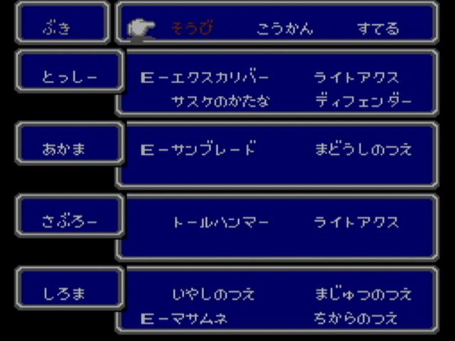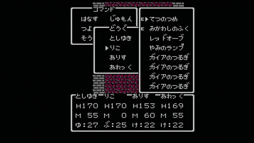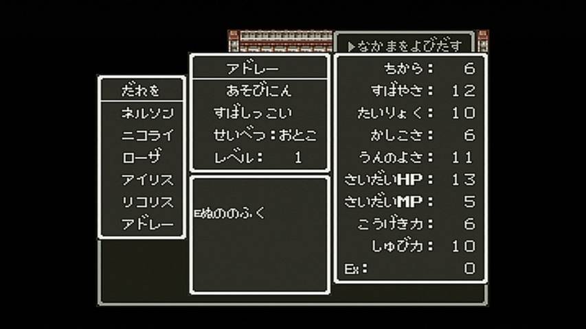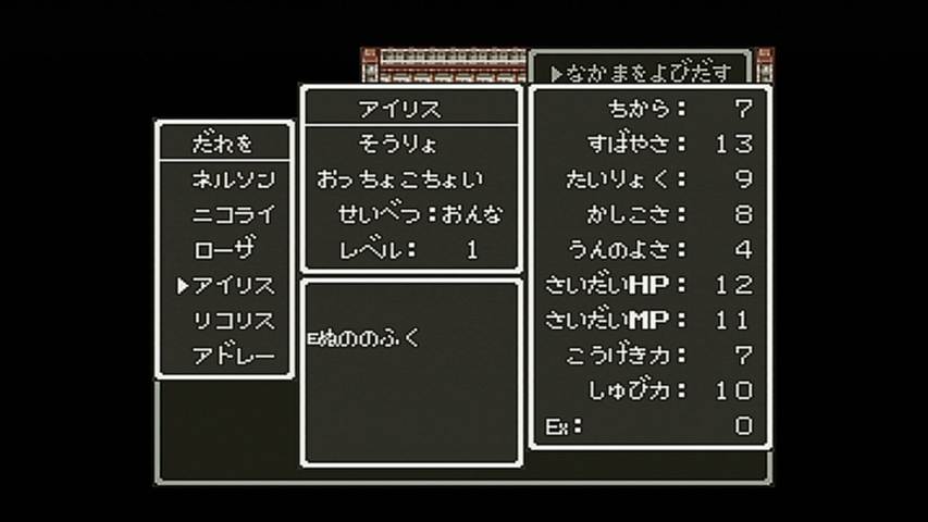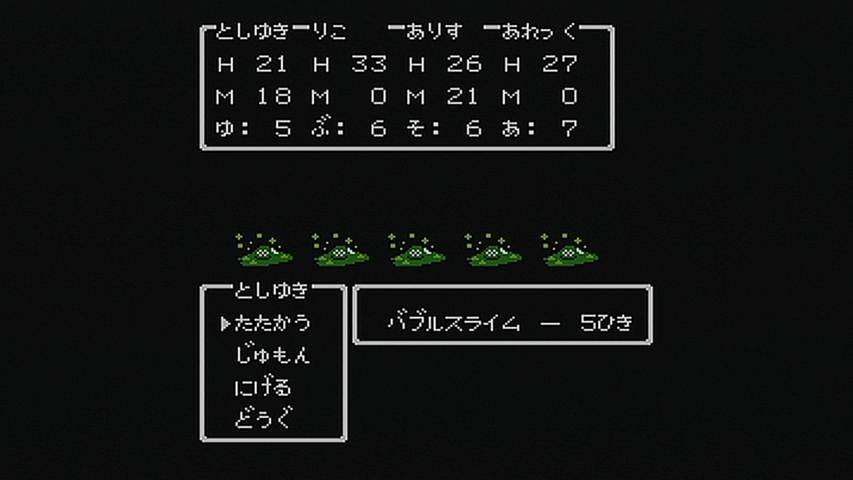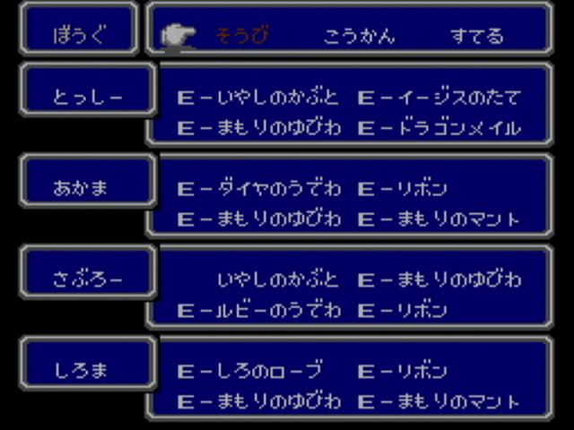 ファミコン版ドラクエ1をクリアして、今はドラクエ3を遊んでいます。 最初にプレイしたのは ファミコン版。 パーティは こんな感じ。 職業は頭文字1文字が表示されているだけですが、僧侶、武闘家、遊び人です。 酒場にいる 戦士っぽい人が言うには、 戦士、僧侶、魔法使いがバランスいいと言いますが、 自分は戦士よりも 武闘家のほうが気に入っています。 まず装備品を揃えなくても十分強い。そのおかげで 道具のスペースも空きができるし、 このゲームでは 守備力は素早さに依存している面もあって、序盤は丸腰でも大丈夫なぐらい。 欠点といえば、後半あたりで 呪文やブレス系への耐性が作れないというところ。 でも、会心の一撃を出しやすいので、メタルスライム狩りにも 役立ってくれます。 それと 遊び人がいるのは もちろん賢者にするため。 役立たずの職業ではあるのですが、たまに遊ぶ事があるだけで、 能力自体は それほど低くはないので、普通に戦うこともできます。 本当に役立たずになり始める頃には 賢者に転職できています。 そして、序盤経験値稼ぎには やはりここ。ノアニールんとこの洞窟。 無理して強いところで戦うよりも、随時回復しもって出来るこの場所のほうが 効率がいいですね。 少し先に行けば、お金稼ぎにはピラミッド、メタルスライム狩りにはガルナの塔5階が最適ですね。 そして、ドラクエ3で 恐ろしいことのひとつと言えば、人喰い箱とミミックの強さ。 普通に進めている場合だと、ダントツの強さで全滅させられる事もありますからね。 3だと 本当の意味でのハズレくじとなっている奴らです。 しかし、ドラクエ5になると ちいさなメダルを落とす場合があるので、 むしろ当たりクジになっちゃってますけどね。 それから 爆弾岩も3が最強だと思いますね。その硬さは異常なぐらい。 ファミコンのゲームといえば バグの多さも見逃せないところなのですが、 そのバグも同じように再現されています。 つまり アイテム増殖とかも可能なんですね。 たとえば・・・ イベントアイテムである ガイアの剣なんかも ホレこのとおり・・・ って、こんなに増やして どうすんの。 やり方は簡単。イベントアイテムの取得可不可の管理は、 そのアイテムを所持しているかどうかで行っているようなので、 それを くぐり抜ければいいだけです。 まず、増やしたいアイテムを仲間に持たせ、その仲間をバシルーラで飛ばす。 そのままセーブせずに、そのイベントアイテムが落ちている場所を調べるだけ。 バシルーラで飛ばしてアイテムを取るまでは、セーブしないこと。 どうやらフラグ管理に使用しているアイテムの所持条件に、 バシルーラで飛ばした直後の仲間は対象に入っていないようなのです。 つまりは こういう仕組みなのでしょう。 飛ばされた直後の仲間は 仮置きの枠に待機させられ、セーブしたときに本枠に入れられる。 ルイーダの酒場で毎回セーブするのは その管理を行うためでしょう。 そういえばポケモンでも 赤・緑と金・銀の頃は、ボックスを切り替えるたびにセーブしてましたね。 それも似たような仕組みなのでしょうかね。 まぁ、イベントアイテムを増やしたところで 単に売れなくなるアイテムに圧迫されるだけでしょうが、 変化の杖を増やせば イベントを進行させてもエルフの隠れ里での買い物はできますし、 ゲーム進行は大幅に壊れますが、一部のオーブも増やせてしまいます。 もうひとつ有効な活用法は・・・ オリハルコンを増やすことでしょう。 王者の剣を作るときに売るアイテムですが、欲しいのは剣ではなく、この買い取り価格にあります。 剣なんて増やしても 勇者しか使えませんからね。 剣を持っていても剣がメニューに並んでいないときならオリハルコンの買い取りは行ってくれます。 これでかなり儲かります。 稼いだからと言って ここまで来てしまうと使い道もなくなってきますが・・・ ファミコン版もクリアして、次はスーパーファミコン版の3に手を付けています。 ゲーム開始時に心理テストのようなものを行うのですが、 結果によって勇者の性格が決定されるので、主人公=プレイヤーという ドラクエが求めていた図式を表現したかのようなシステムですね。 そしてパーティは こんな感じ。今回は武闘家のかわりに盗賊を入れてみました。 やはり素早さの高い職業なので、守備力も高いです。 それに今回は 道に落ちているアイテムも多いので、盗賊が覚える「呪文」が おおいに役立ちます。 スーファミ版はドラクエ6基準になり、ブーメランやムチなど、 複数に攻撃できる武器も増えたわけですが、細かなバランスを求めるとファミコンとの違いはあれど、 それでもゲーム全体のバランスを大きく損ねることには なっていないのは確かです。 戦闘のテンポがよくなって 快適になったのは間違いないですね。 スーファミになった事で グラフィックやサウンド面もパワーアップしてますね。 地形にもだいぶ変化が見ら