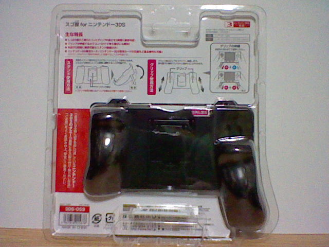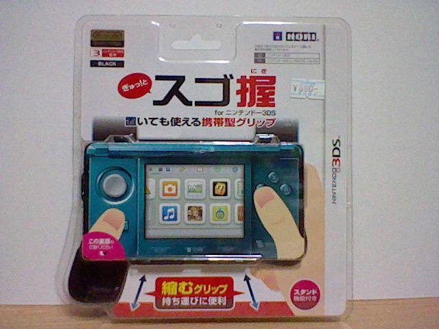 ホリの3DS用のグリップを購入しました。 グリップ類は非ライセンス商品では いくつか出ていたけれど、 ライセンス商品では これが最初の製品でしょう。 後ろのスタンドを開くことで、立てて置くことも可能。 タッチペンのみで操作を行うゲームや、視聴だけを行うソフトを使用する際には便利。 スタンドは2種類あり、2段階の傾斜で立てることも可能。 グリップ部分は可変式で、ちぢめてもよし、伸ばしてもよしで、好みで使い分けることもできる。 とくに十字ボタンの操作を行う際には、伸ばして使うとかなり安定する。 なにより 大きすぎないため意外とかさばらず、装着したまま持ち歩くのにもいい。 ただ、背面のスタンドが ものすごく硬く、開きにくいのが難点。 なので、この部分の角を、カッターで少し削ってみたら、かなり開きやすくなった。 子供も扱う事も考えられる製品なので、そういう部分はもう少し配慮しておいてほしいところではある。 とはいうものの、ネジも惜しみなく使われていて、全体的にシッカリしている。 これだけの特徴がありながら 1000円という価格も なかなかのところ。 PR