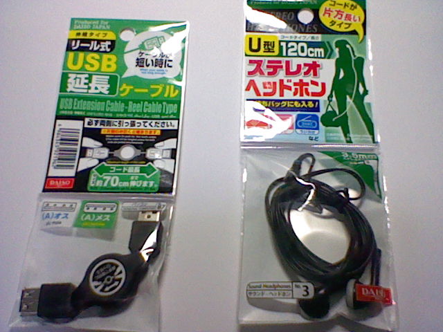 今回は イーカプコンでプレミアムパッケージを注文。 キッカリ8000円でした。 ミッちゃんのフィギュア付きです。 よくできてます。 御剣検事の りりしいお姿が 事細かく再現されております。 ”オバチャン”には あまり見せたくないほどです。 パッケージは そのままケースにもできる。 側面には 気品さが漂う赤色のカーテンが描かれている。 ソフトのほうは こんな感じ。これは外箱。 ミクモのドット絵が描かれた ストラップも付属。 サントラのほうは オーケストラアレンジが収録された楽曲集と プロモーション映像が収録されたDVDが付属。 サントラのほうが ゲームを一通りプレイしてから聴くつもり。 さて、ゲームのほうは Wiiから配信されていた体験版をプレイしてみましたが、 体験版の終わりには”奴”の姿が・・・ ヘンなのが多数出てくる このシリーズですが、今回は どうなることやら・・・ ダイソーで買いました。伸縮USB延長ケーブルとヘッドホン。 USB延長ケーブルは 以前420円のものがあったけど、最近めっきり見なくなったと思ったら、 とうとう105円になってたわけなんですね。 パッケージには 書かれていないけど、どうやらUSB2.0も対応っぽい。 もはや 当たり前だから書くまでもないというわけなんでしょうか。 ヘッドホンのほうも、最近ネオジムマグネットを使用したものが 店頭から姿を消していったわけですが、 今回のは 105円のものでもネオジム式よりは重低音が若干劣るものの、音質自体は すごくいいです。 こちらはダイナミック型を採用。 一度本格的なものを買おうと思い、専門の店を のぞいてみたのですが、ほとんどカナル型(密閉型)ばかりで、 個人的には 付けたときに耳の中でごぼごぼして あまり気に入ったものではなかったのです。 そういう意味でも このタイプが しっくり来るし、 なにしろ安いので 気兼ねに使えますからね。 買ってソンはない オススメの品です。