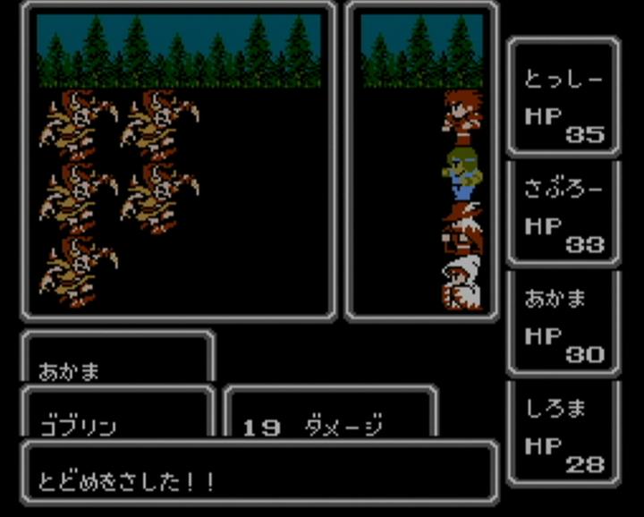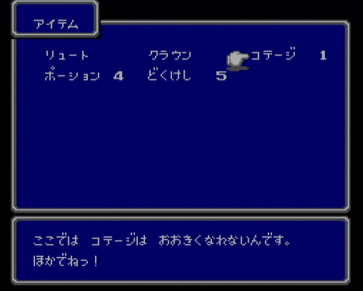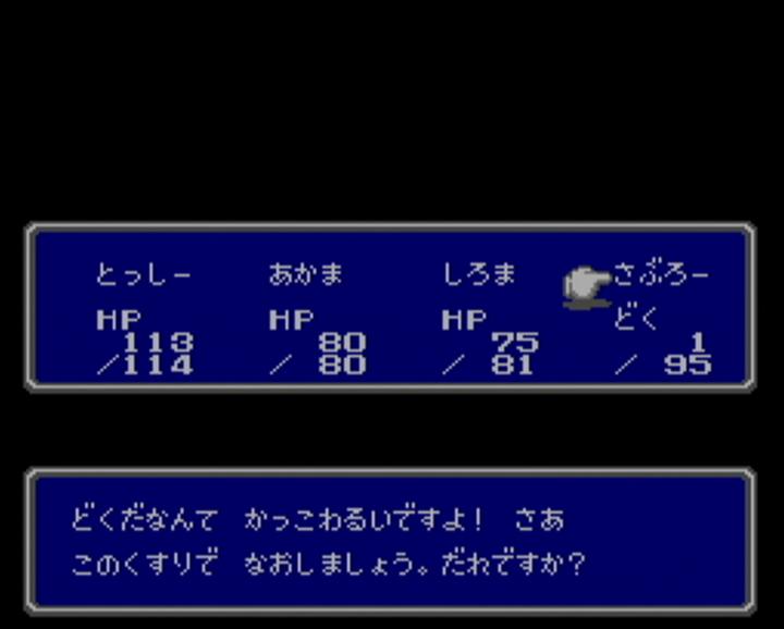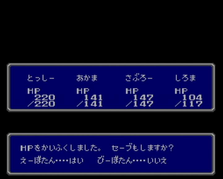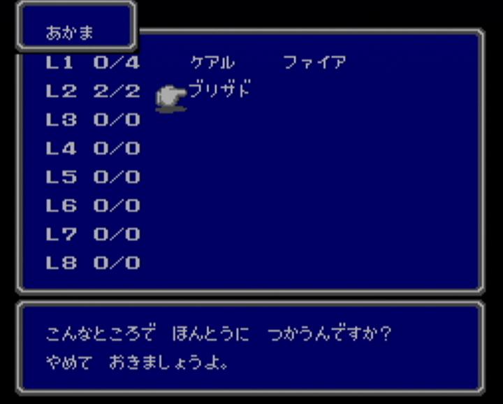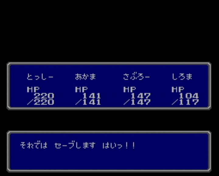 最近は 新作だけでなく、古いゲームを再度遊んでみようと思い、 スーファミの 天地創造と聖剣伝説3を やっていました。 そして、次にやろうと思ったのが、ファイナルファンタジー。 そう、ファミコンの ファイナルファンタジーを やってみようかなと思いました。 それで 中断機能もあるし WiiがいいかなーっとSDカードメニューを あさってみても・・・ なかったので、たった今 購入しました。 パーティは こんな感じ。 名前は・・・ 赤魔と白魔考えるのに 力尽きました。 なにしろ 使える文字が ひらがな だけですものね。 しかし、なぜか数字は使えるんですよね。名前に・・・ 公式では デフォルトがバランスがいいとの事ですが、 実際には その中に入っているシーフが 役立たずという話だそうなので、外しました。 船を手に入れて エルフの街まで到着したところ。 おはか ですか。はい、おはか ですね。 しかし、左のお墓には・・・ 「リンク」って 誰のこと?? あのリンクの事でしょうか? エルフの街の北にある さびれた城には王様が一人・・・ クラウンを取ってくれば 王国が元に戻るとのこと。 クラウンって 王冠の事ですよね? 王冠ひとつで元に戻る国って一体・・・ でも、昔のゲームだから、そんな唐突な展開も ありなのかな・・・? やっとの事で 洞窟からクラウンを取って脱出し、 せっかくだから もうそのまま王様に渡してこようと思ったら・・・ ああ、やっぱり その展開だったのですね。 これには意外と だまされましたよ。 しかも 洞窟から戻ってきて この状態・・・ MPも ポーションも尽きて 回復手段はナシ。 しかし・・・ なんとか勝利できました! 昔のゲームだけに バランスは大味かと思いきや、エンカウント率は意外と適切。 操作は もっさりしていて時間はかかるけど、 しっかりレベルを上げたりしていれば 詰まる事はないかとも。 しかし、面白いのは それだけではありません。 フィールドで攻撃魔法を使おうとすると・・・ 誰かに止められます。 毒を受けて 何がかっこ悪いだよ、余計なお世話だよ! こっちは好きで毒を受けたんじゃないんだよ。というわけで、お願いします。 それにしても 毒治しの魔法「ポイゾナ」が レベル4で4000ギルと高すぎ。 いえいえ、こちらこそ すいません。 街中では 寝袋は使えないんですね。そりゃ道のど真ん中で 寝袋で寝てたら 誰だってビックリしますよね。 ポーションを ぬったげてくれるんですね。 ていうか、ポーションって ぬりぐすりだったの? FF5の攻略本では アメ玉みたいな物だったような気がするけど・・・ 寝袋はフィールドで使うもの。 というわけで 使ってみたらセーブまでしてくれるんですか。 「それでは セーブします はいっ!!」 セーブに そこまで気合を入れるものなのですか。 寝袋同様、フィールドでしか使えないコテージは・・・ なんと! コテージは大きくなるものなんですね。 いつも どうやってコテージを持ち歩いてるんだろうと疑問に思っていましたが、 その疑問が たった今解消されました。 某未来から来た猫型ロボットの秘密道具のように 小さくなってたわけなんですね。 空の宝箱を調べてみたら・・・ 「からっぽ だっ!!」と、力強く言われました。 空っぽな事が それほどまでに衝撃だったのでしょうか。 それにしても、メッセージも遊び心があって面白いです。 今となっては こういうのって どうなんでしょうね・・・ PR