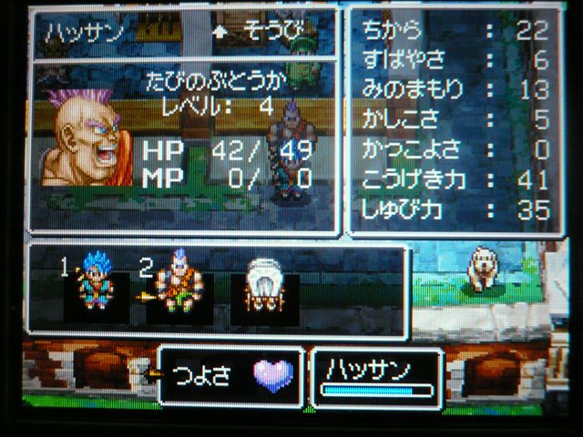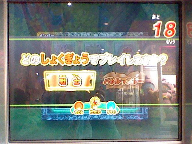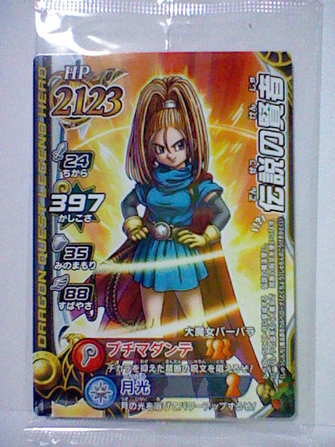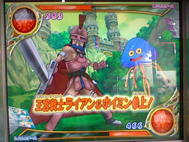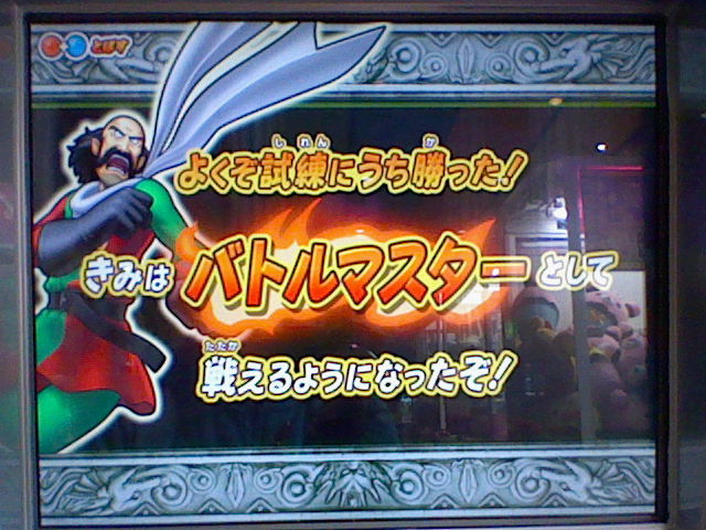 0時に閉店のセガワールドに、11時半ぐらいに キリギリで バトルロードを1回遊んでいます。 遊んだ後は もちろんカード購入。ある程度遊ばれた後なのか、 いいところに 黒カードが来ている事が多く、今はそれを狙っています。セコイ! そうでなくても、今は ほぼ10枚単位で出ますからね。 さて、今日は ようやくバトルマスターになれました。 ライアン! あなたと戦える日を どんなに待ち望んだか。 ダーマの神殿チャレンジバトルの発生率は かなり低いようなので、負けられません! ゆえに緊張しまくりのバトルです。 いざ戦ってみると、思うように ダメージを与えられない! やはりここは とどめの一撃勝負かと思い、 3ターン目に つばぜりあい。 300強程度に減ったHPを 賢者の石で回復。 とにかく確実に ゆうきを貯めようと、ボタンの反応を気にしながらの持久戦。 そして・・・ とどめの一撃成功! とどめの一撃に使ったのは ライアンのカード(仁王立ち)! 目には目を、ライアンにはライアンを! やったぜ! ライアンとホイミンの攻撃が ライアンとホイミン(とジョニー)を 倒したぞ!! ていうか、とどめの一撃のライアンたちは マネマネだったりして。 めでたくバトルマスターに!! さっそくバトルマスターを試してみたいと、 閉店ギリギリの崖っぷちながらも もう1回プレイ! ・・・と やったのが間違いだったかもしれません。 バトルマスターには、剣などを装備した際に、手動で選べるんですね。 てっきりウェポンダブルスキャンによって 自動的になるものかと・・・ どちらにせよ、ウェポンダブルスキャンについて 調べておかないと。 こんなときに限って バラモスが出てきて、 経験値は欲しいと思ったので とりあえず勝利して、お次はゾーマ。 とても勝てる気がしない ではなくて、閉店間際で勝つ気がしなかったので、 もう適当に戦って 負けてあげました。 店内に流れる蛍の光が これほど急かされる曲となろうとは・・・ バトルマスターになったと言っても、最初のうちは普通です。 しかし、ウェポンダブルスキャンが可能になるなど、戦い方に広がりが出てくるでしょう。 しかし、チーム相性の点も考えると、 今まで共に戦ってきた お気に入りのスライムナイトとキラーパンサーは、 しばらく馬車入りか? とにかく、目指せ! バトルマスターマスター です。 最近遊んでて思うけれど、 アンデッド系や 闇属性を使うモンスターが やけに強く感じてきました。 一度 呪いで動けなくされて 手も足も出なくなった事もあったり、 それがなくても 普通に強く感じることも・・・ いつもの戦法も 通用しなくなってきたか? しかし、どんなに有効なモンスターが出ようとも、 自分の好きなモンスターは 通していきたいものです。 最後に、最近手に入れたカードです。 閉店間際の落穂拾い的ですが、ミレーユさんのカードも 2枚手に入りましたよ。 帰りは遅くなっても、やめられませんね これは。 ようやく初リメイクとなる ドラクエ6が発売されましたね。 もう予約して買ってから やりまくっております。 モンスターバトルロードⅡの バーバラのカード封入。 スペシャルカードではなく、これを使えば 実際にバーバラさんが出て 戦ってくれるようです。 使ってみたいけど・・・ もったいなくて使えないなぁ・・・ いっそ カラーコードをコピーしてって・・・それは邪道か。 というわけで、実際プレイ。 村長さんから渡されるはずの袋を はじめから持っているんですね。 ライフコッド村の景色が きれいです。 2画面構成で奥まで見渡せますね。 カメラをぐるぐる回してみる。 こんな起伏のはげしい村だったのか。 おつかいが最初の冒険。 シエーナがマルシェに変わってます。変更の理由はなんだろう。 あーなんかカレー食いてぇ。 サンマリーノのメイドのサンディの名前も メラニィに変更されてましたね。 これはドラクエ9にサンディという名前が 使われるようになったからでしょうね。 村長さんの家で こんな本を発見! 人間には よくわからない内容のようです。 この他にも 所々に連載小説みたいな本があるので、本だなを調べていくのも楽しいです。 戦闘もDS版4・5同様、敵が常時動いていて、脈動感があります。 2Dながらに 動きがなめらか。 「じゅもん」の項目はなく、「とくぎ」になっていて、 呪文も それに含まれるようになったようです。 シエーナ改めマルシェの町。 露天からテントづくりに なっていました。 表現方法も豊かになったせいか、町ごとに 雰囲気が作られてますね。 高ぇよ!! ボッタクリは あいかわらずですなぁ。 一方 こっちはお買い得。 せいすいが 2ゴールドになっちゃいますからね。 安いだけでなく、まとめ買いのできなかったスーファミ版では、よくここを利用してました。 ドガボガの抗争は あいかわらず。 値段は安くても 弟のほうに売ってあげてたものです。 でも今回、売らずに進めてしまいました。 カギは 専用の店ができたようですね。ひとつしか買えません。 